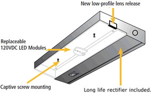Completely self-contained under counter light fixture with replaceable 120VDC LED Modules included. Dimmable. Twice the light output as Xenon/Halogen technology with 72% energy savings. 120VAC in and out up to 150 replaceable LED Modules per 15A tap. Numerous contractor preferred 1/2" knockouts in each fixture. Offered in five sizes and four fixture finishes. UL Listed Damp Location.