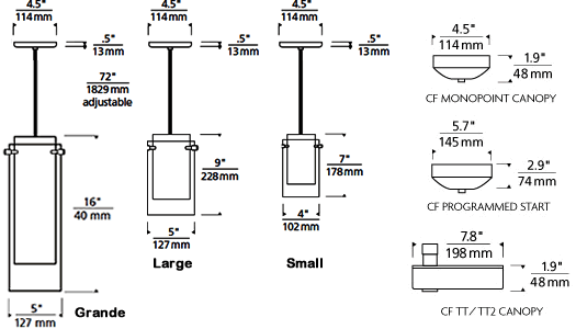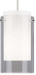 Transparent cylinder shade over a white case glass cylinder. Black satin nickel, and white finish options include three satin nickel cylinder details and clear cable; antique Bronze finish includes three antique Bronze cylinder details and brown cable. Available in three sizes: small, large and grande. Fixture is provided with six feet of field-cuttable cable. Incandescent version dimmable with standard Incandescent dimmer.