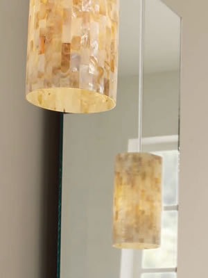 Elegant multi-toned shade comprised of natural shell panels. The shells are burnished to remove rough edges, meticulously polished, cut to size, and carefully adhered by hand to an inner glass cylinder; suspended from a round canopy. Black, satin nickel, and white canopy options highlighted with clear cable; antique bronze highlighted with brown cable. Includes 120 volt 60w or equivalent A19 medium base lamp or GX24Q-3 base 26w triple tube compact fluorescent lamp (electronic ballast included). Fixture is provided with six feet of field-cuttable cable. Incandescent version dimmable with standard incandescent dimmer.