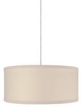 Modern simple round fabric shade with glass diffuser provides a glare free wash of light; highlighted with metal detail. Includes two low-voltage, 35 watt Halogen bi-pin lamps and six feet of field-cuttable suspension cable.