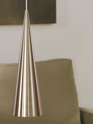 Sleek satin nickel metal cone, available in large and small versions. Includes low-voltage, 35 watt MR16 flood lamp or 6 watt replaceable LED module and six feet of field-cuttable suspension cable.